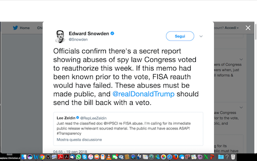 Giusto il tempo di dormire un poco e mi ributto sulla news, con la certezza che sarà esplosa dal New York Times a Repubblica, passando per CNN, BBC e RAI. Nulla. Vado su Fox News, e in prima non c’è più nulla! Perdo il fiato. Ma lo recupero quando Zero Hedgepubblica un Tweet del più autorevole fra gli autorevoli, Edward Snowden, che conferma tutto, lo vedete sopra in foto. Eppure, di nuovo, ago e filo hanno cucito la bocca e le dita di tutto il mondo dei media che contano in un istante, e con un potere di assolutismo che davvero non credevo possibile a questo livello. La news dalla vetta del mondo, non dal Nepal ma da Washington D.C., è di nuovo ‘suicidata’ sulle testate e sugli schermi più noti del pianeta, PUR ESSENDO USCITA IN PUBBLICO. E’ possibile che lo stesso Donald Trump sia parte di questa incredibile congiura del silenzio, per barattare coi suoi nemici e per poterli poi ricattare per anni, ma ciò non cambia la sostanza di questo articolo.