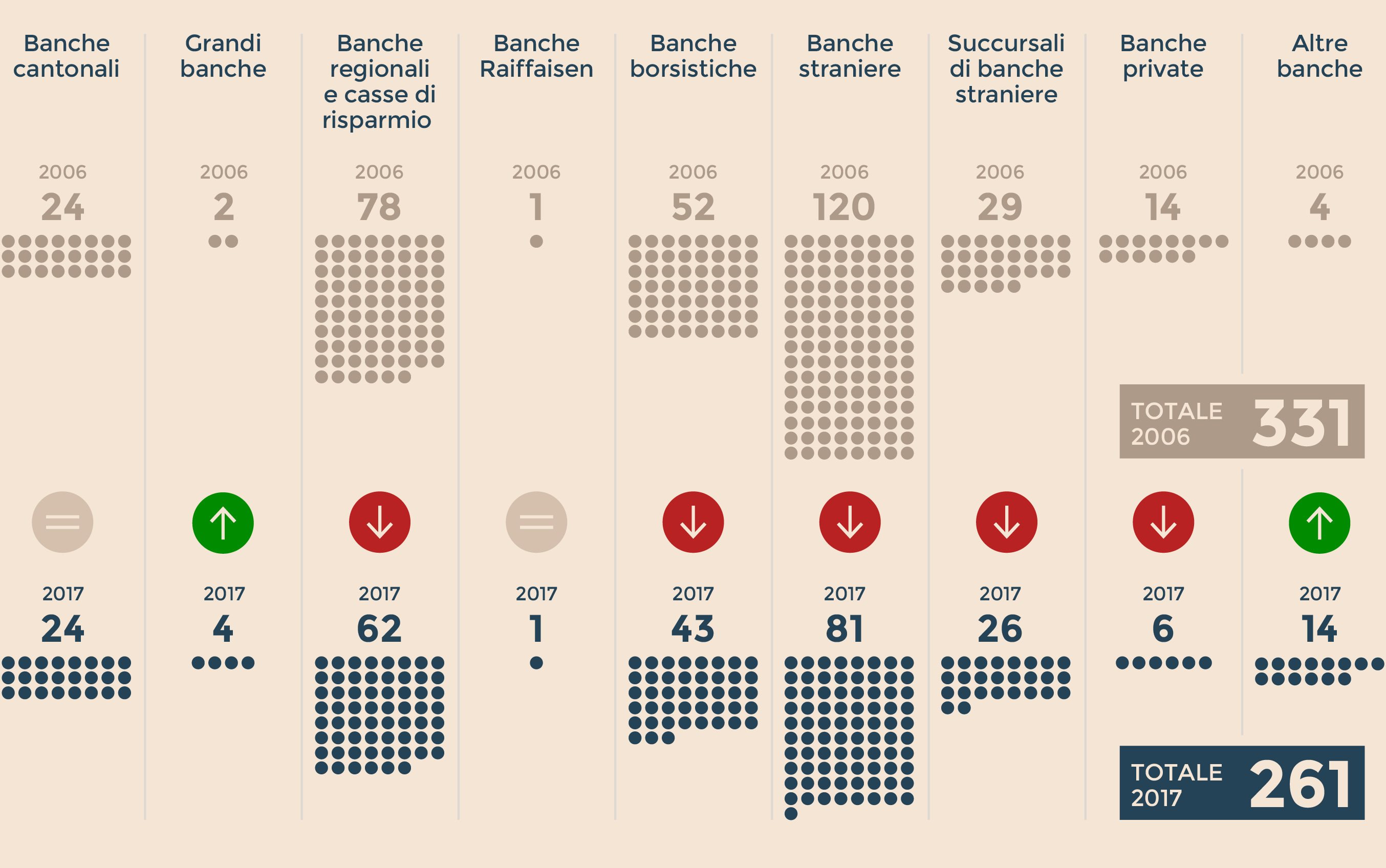 Secondo i dati del Dipartimento federale delle Finanze svizzero, nel 2006 nella Confederazione erano presenti 331 banche. Alla fine del 2016 il loro numero era sceso a 261, con un calo del 21%. I dipendenti del settore finanziario erano 195.600 dieci anni fa. Nel 2016 erano scesi a 144mila, il 26% in meno. Secondo una stima della società di consulenza PwC, dal 2008 al 2014 sono defluiti dalla Svizzera 350 miliardi di franchi gestiti dagli istituti bancari elvetici.