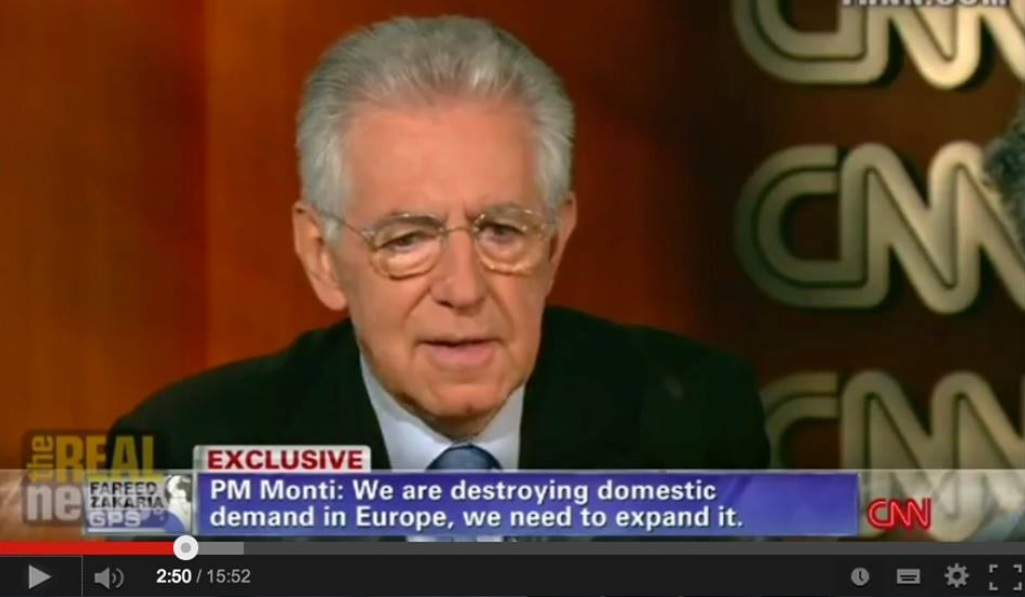 Il progetto di distruzione della domanda interna è stato dichiarato esplicitamente dal signor Monti in una intervista esclusiva alla CNN, di cui vi riporto qui sopra un fotogramma.
