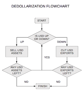 Comunque, non sarebbe saggio lasciarsi prendere dal panico, perché, in una situazione di panico, chiunque viene spazzato via in fretta. Il giusto approccio alla dedollarizzazione è quello di lavorarci su, diligentemente, tutti i giorni, seguendo una strategia che minimizzi le perdite. Il collasso del sistema del dollaro americano non sarà, per la maggior parte delle persone al mondo, un’opportunità per far soldi. Sarà invece una scelta fra il perdere qualcosa e il perdere tutto, e io consiglierei la prima delle due. E così eccovi il pratico diagramma di flusso per la dedollarizzazione che ho realizzato. Se lo seguirete coscienziosamente, vi troverete, a tempo debito, completamente dedollarizzati. Lascio a voi decidere il grado di aggressività delle vostre azioni, in base alla vostra sensazione soggettiva sull’imminenza dell’evento.