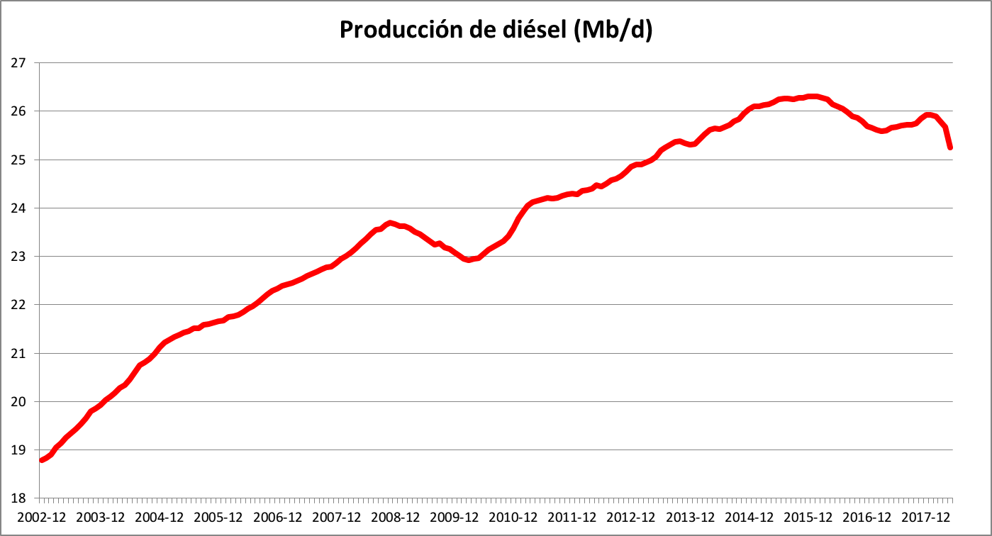 Quest’ultima osservazione è abbastanza pertinente, perché se si può intuire che se c’è meno olio combustibile pesante da trattare per garantire che la produzione di gasolio non si abbassi, la rapida caduta di olio combustibile pesante trascinerà rapidamente anche il gasolio verso il basso. Infatti, il grafico mostra che, dopo la caduta nel 2015 e nel 2016, nel 2017 è stato possibile stabilizzare la produzione di tutti gli oli combustibili, ma si è visto anche che negli ultimi mesi la loro caduta è piuttosto rapida. Sicuramente, nella scarsità di gasolio si comincia a notare la mancanza dei 2,5 Mb / g di petrolio convenzionale (più versatile per la raffinazione e quindi più adatto alla produzione di olio combustibile), come aveva detto l’Agenzia Internazionale per l’Energia nella sua ultima relazione annuale. Questo spiega l’urgenza di sbarazzarsi del gasolio che ha recentemente scosso le cancellerie d’Europa: si nascondono dietro reali problemi ambientali (che il motore diesel ha sempre causato, ma finora gli importava un piffero) per cercare di adattarsi rapidamente a una situazione di scarsità. Carenza che può essere brutale per non aver preso provvedimenti per una situazione che si sapeva doveva arrivare.