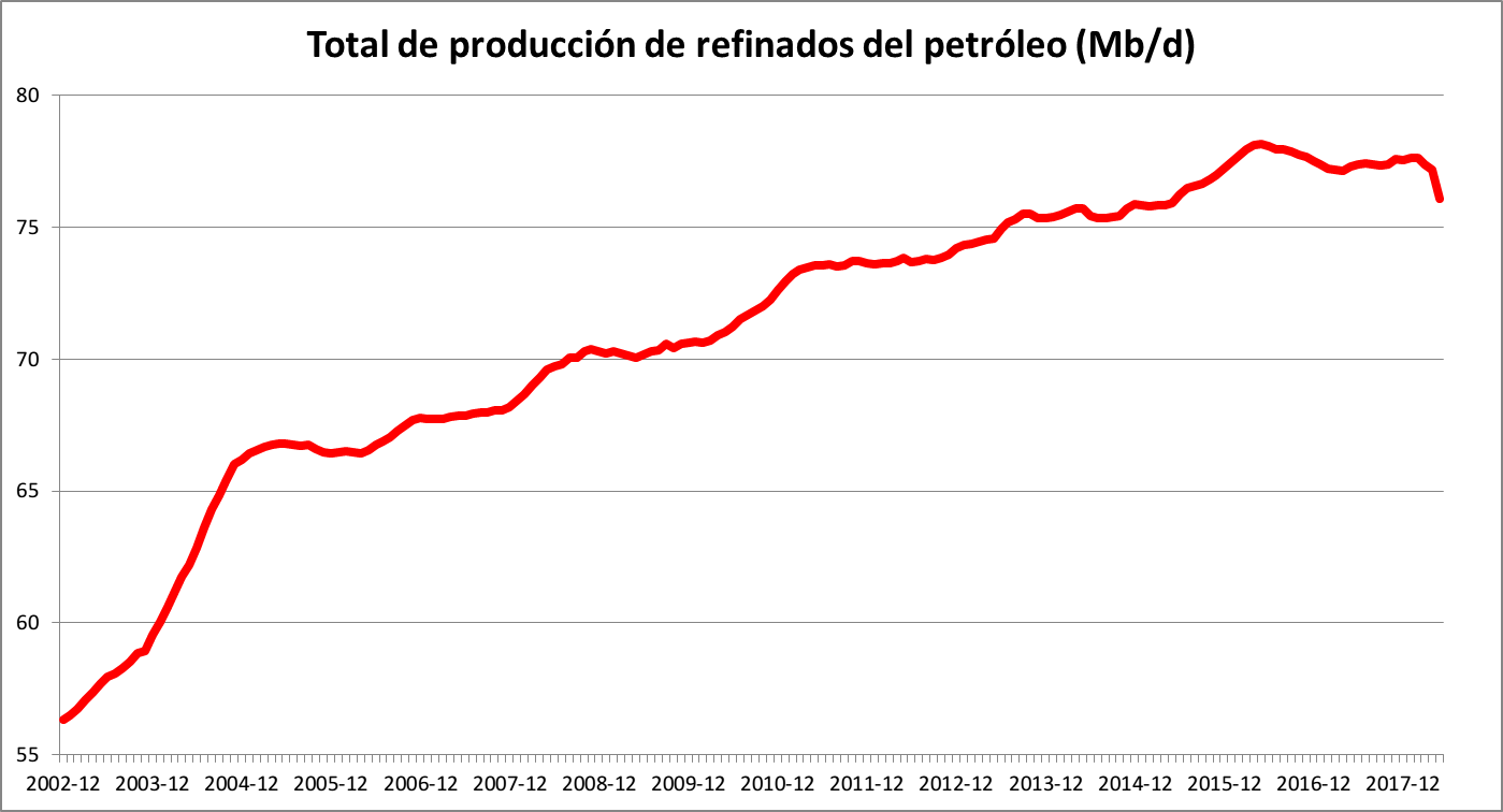 Come mostra il grafico, dal 2007 (e quindi prima dell’inizio ufficiale della crisi economica) la produzione di altri oli combustibili è in declino e sembra una tendenza perfettamente consolidata. L’interpretazione abituale degli economisti è quella di considerare che semplicemente non c’è una domanda per questi combustibili (sebbene siano della stessa famiglia del gasolio). Quando il petrolio viene raffinato, viene sottoposto a un processo chiamato cracking, in cui le lunghe catene molecolari presenti nel petrolio si rompono (attraverso il calore e altri processi) e quindi le molecole vengono separate dalle loro differenti proprietà di fluidità e densità.