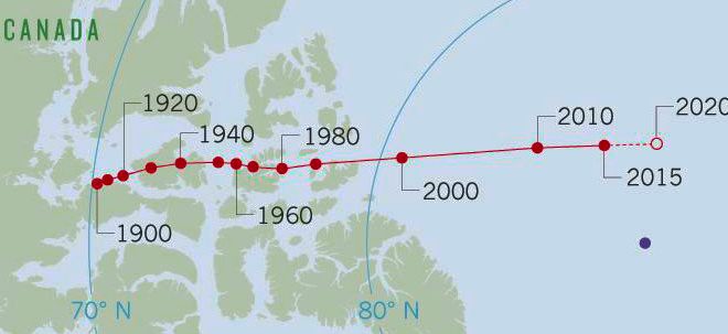Nel 2018, il polo ha attraversato la linea di cambio-data internazionale nell’emisfero orientale e, attualmente, sta facendo rotta verso la Siberia settentrionale.