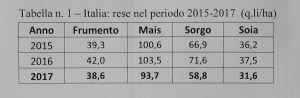 Le principali produzioni agricole sono diminuite; mi sono limitato a riportare i dati produttivi del triennio 2015-2017 (tabella n. 1) per alcuni cereali e per la soia: le rese nel 2017, rispetto alle rese medie del biennio precedente sono calate del 5% per il frumento, a ciclo autunno-primaverile; i cali nelle rese sono stati maggiori per i seminativi a ciclo primaverile-estivo.