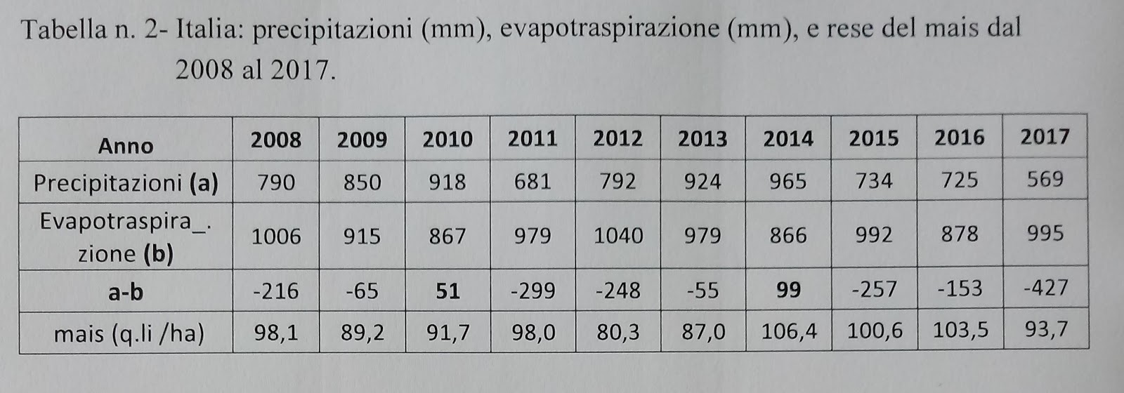 I dati della tabella n. 2 sono significativi: in un solo anno, il 2017, si è concentrato oltre un quarto del deficit idrico del decennio 2008 – 2017; le rese del mais sono calate notevolmente anche nel 2012 dopo due anni consecutivi di un consistente deficit idrico iniziato nel 2011 e che, sommato a quello del 2012, ha raggiunto i 547 mm .