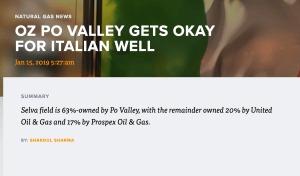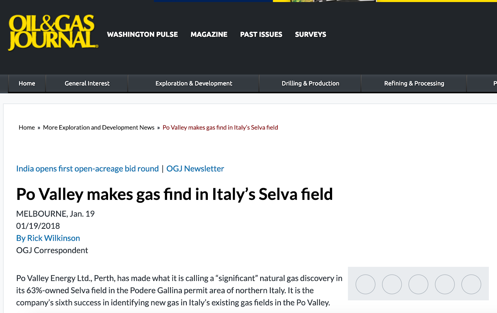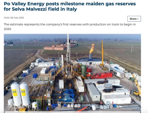 La Po Valley ha rilevato diverse vecchie concessioni nel Nord Italia, quasi tutte un tempo dell’ENI e dicono che questo e’ il sesto successo che ottengono, nel riportare in vita campi gia’ dati per esausti.