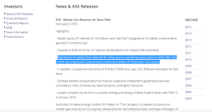 Cosi tutto quello che posso fare e’ di leggere i comunicati agli investitori fatti ormai piu’ di un mese fa dalla Po Valley Energy d’Australia e che sono alquanto inquietanti. Si, la Po Valley, quelli che dicevano, per bocca del loro rappresentante Pierluigi Vecchia, che volevano trivellare in Emilia Romagna per motivi affettivi!