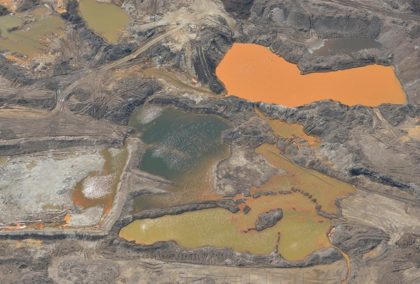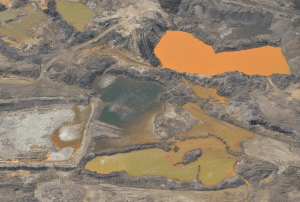 Oltre allo smantellamento di foresta boreale i laghi artificiali di monnezza a cielo aperto per metterci l’acqua ora tossica. Contengono monezza per 500 mila piscine olimpioniche. Si, cinquecentomila piscine! L’acqua e’ cosi tossica che se ci cadono gli uccelli muoiono stecchiti. Le morie sono cosi frequenti che devono esserci messi degli spaventapasseri. Non sempre funzionano.