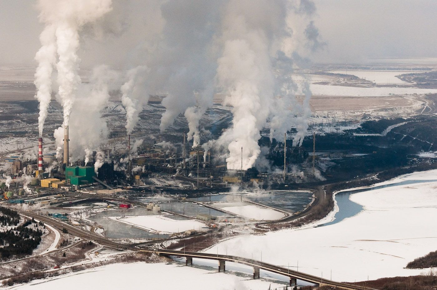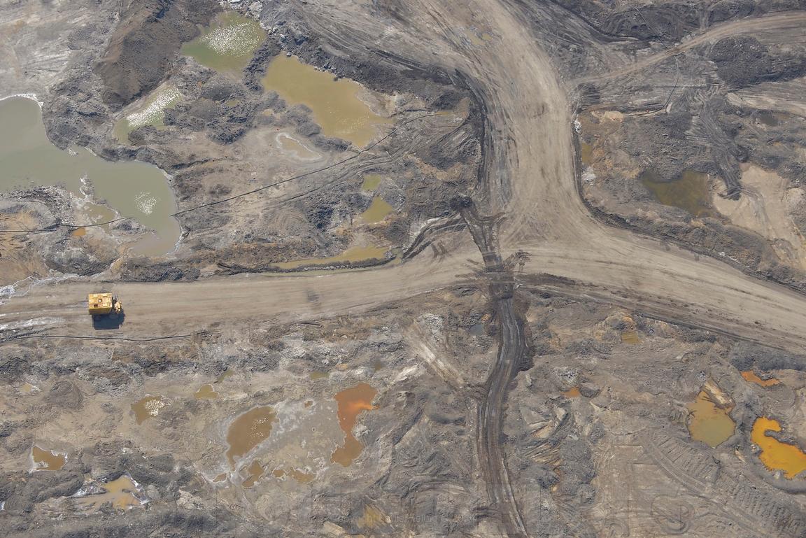 Fanno ottocento chilometri di impianti di estrazioni di petrolio, raffinerie, desolforatori, vasche di monnezza varia, acqua inquinata. Ottocento chilometri, senza sosta. Nel complesso l’area in sui si eseguono queste operazioni di estrazione di Tar Sands e’ grande quanto l’Inghilterra intera.