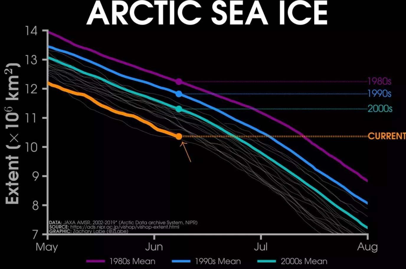 E’ stato il Maggio piu’ caldo che mai, con temperature in Russia fino a 29 gradi. In Maggio! Il permafrost in Canada indietreggia di 1 metro al giorno. I livelli complessivi di ghiacci sono