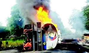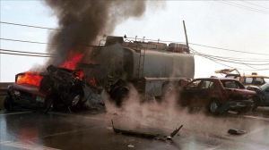 L’autista di un camion carico di petrolio ha perso il controllo del suo veicolo. Il motivo e’ molto semplice: davanti al camion c’era un autobus che ha perso uno dei suoi tubi di scarico. La caduta ha causato delle scintille che hanno portato all’incendio del camion carico di petrolio.