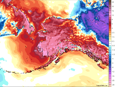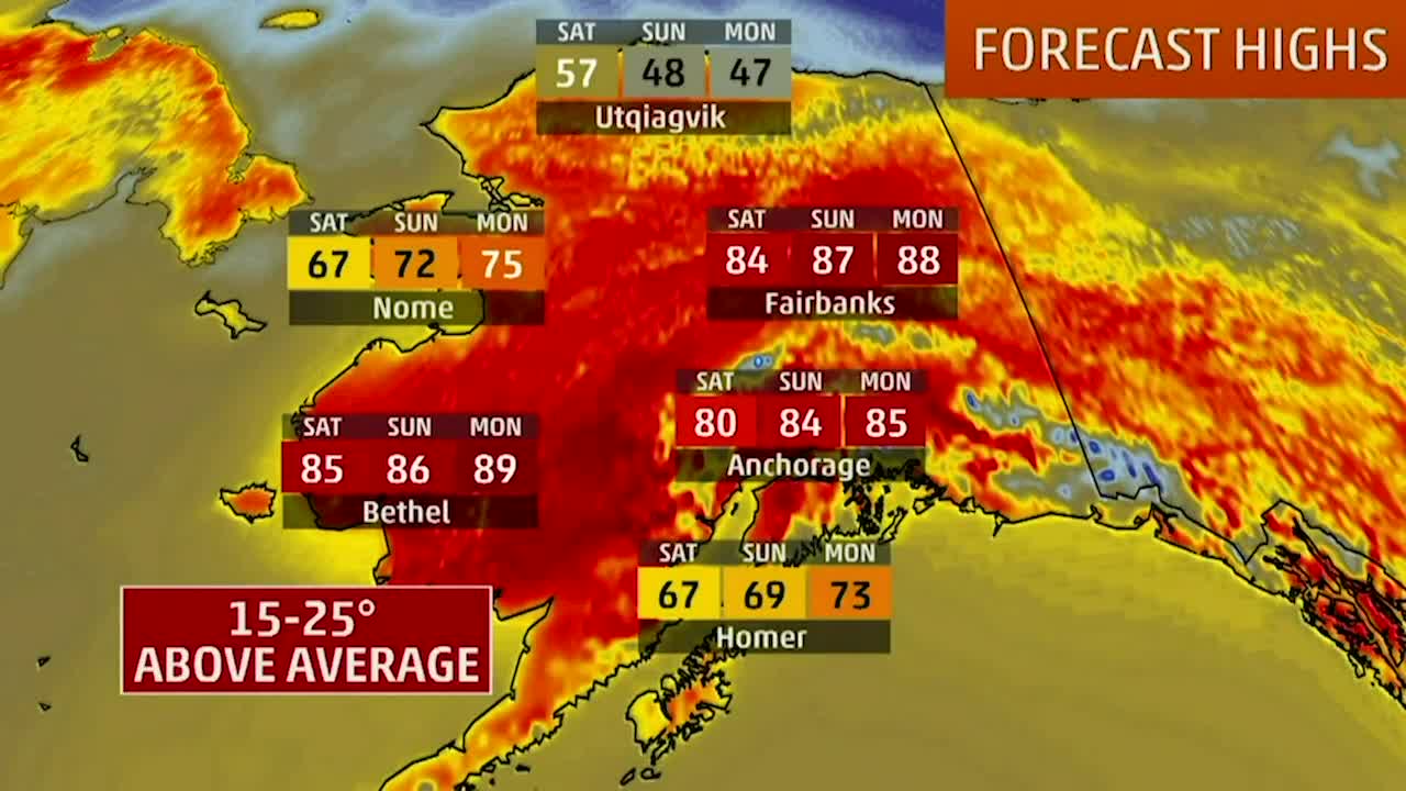 Ad Anchorage, una delle citta’ piu’ grandi, la temperatura e’ arrivata a 32 gradi, record mai raggiunto qui. I meterologi prevedono una lunga, lunghissima, ondata di caldo ulteriore. La temperatura media e’ di 24 gradi. Quindi siamo ad 8 gradi in piu’ della media. Nel circondario vari incendi che hanno mandato in fiamme foresta boreale, permafrost e tundra. Per paura che arrivino ancora piu’ incendi in zona, il 4 luglio non ci sono stati fuochi pirotecnici.