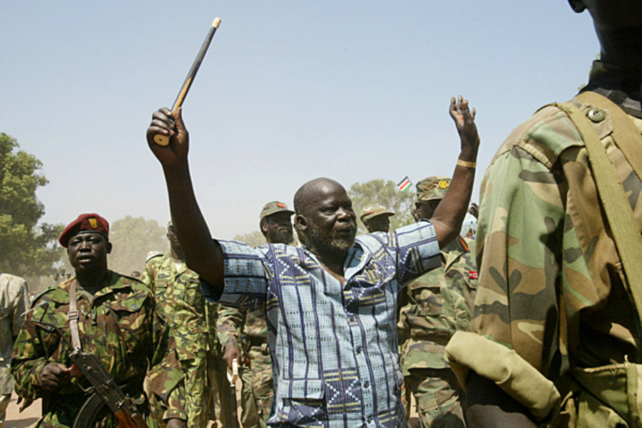 * (Immagine in alto: John Gargang, leader del Movimento di liberazione popolare del Sudan è circondato da soldati mentre saluta la folla in questa foto del 22 gennaio 2005. Credito: Karel Prinsloo / AP / File)