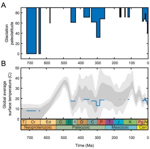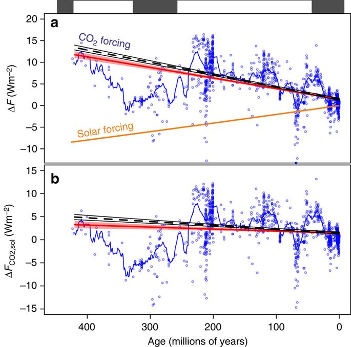 Vediamo alcuni dati da un articolo del 2017 di Foster, Royer e Lunt che possono essere visti come prova dell’esistenza di Gaia anche se non menzionano mai il termine. Non si tratta di nuove scoperte, ma utilizza i dati disponibili per vedere come la concentrazione di CO2 e l’irradiazione solare variavano negli ultimi 400 milioni di anni, la maggior parte dell’eone che chiamiamo “Fanerozoico”. L’articolo è abbastanza tecnico, ma scritto in modo molto chiaro. Si fa leggere anche da chi non è uno specialista in fisica dell’atmosfera. Ecco i risultati principali: