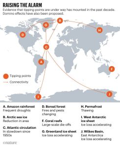 Questi includono la deforestazione in Amazzonia, la riduzione del ghiaccio marino artico, la distruzione della barriera corallina su larga scala, lo scioglimento delle calotte glaciali della Groenlandia e dell’Antartide occidentale, lo scongelamento del permafrost, la destabilizzazione delle foreste boreali e un rallentamento delle correnti oceaniche.Si tratta di eventi che avranno un effetto a cascata sulla crisi climatica in atto. Ad esempio, l’Artico si sta riscaldando almeno due volte più rapidamente della media globale; lo scioglimento del ghiaccio marino artico sta contribuendo ulteriormente a tale riscaldamento.