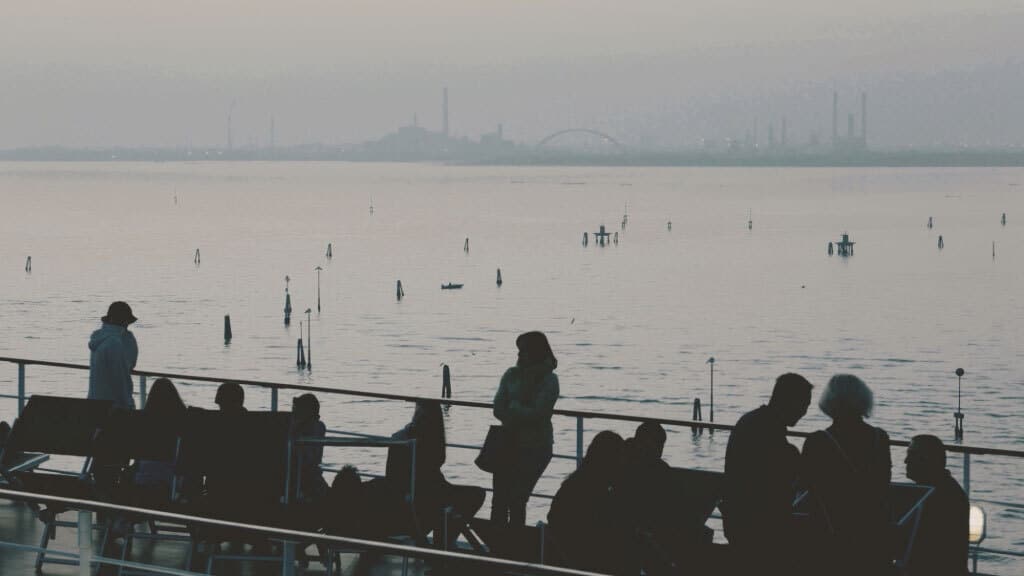 Gli altoparlanti della nave alternano musica latinoamericana e disco anni settanta, a suggerire un’aria di festa. Ma in riva dei Sette Martiri una buona metà dei passeggeri ha già salutato davvero la città ed è scesa verso i ponti inferiori. Infine, arriva quel momento emozionante e magico in cui si attraversa la bocca di porto e la laguna diventa mare. Gli altoparlanti diffondono The hustle ma inutilmente, poiché a questo punto sul ponte nessuno o quasi è rimasto ad ascoltarla, né ad ascoltare il mare.