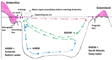 Per studiare gli effetti della crescente fusione di ghiaccio della calotta groenlandese e dell’Antartico sono stati usati simulazioni numeriche climatiche, dati paleoclimatici ed osservazioni sui processi in corso. Infatti, la mappa mondiale dell’anomalia delle temperature mostra ovunque aumenti rispetto al periodo di riferimento 1981-2010, eccetto che nell’Atlantico a sud della Groenlandia e attorno all’Antartide, dove si osserva un raffreddamento determinato della fusione dei ghiacci continentali. Tale fenomeno, sta avvenendo con una o due decadi di anticipo rispetto a quanto previsto dai modelli climatici, e potrebbe essere l’inizio di un processo irreversibile. In pratica, l’afflusso di acqua dolce nell’oceano, con la sua densità minore rispetto le acque salate, provoca una stratificazione che intrappola l’acqua calda, impedisce l’omogeneizzazione della temperatura dell’oceano e rallenta (per ora, ma potrebbe interromperla) la circolazione termoalina. A sua volta, con un effetto di feedback positivo l’acqua calda destabilizza le lingue glaciali antartiche dal di sotto, penetrando lungo la superficie rocciosa di fondo, che in Antartide si approfondisce verso l’interno del continente. La perdita di ghiaccio sembra progredire in maniera esponenziale piuttosto che in maniera lineare, come nei modelli considerati dall’IPCC, possibilmente con tempi di raddoppio della velocità di aumento del livello marino vicini al termine inferiore dell’intervallo sinora stimato, cioè 10 anni. Ciò significa che entro la fine del secolo il livello marino potrebbe salire di molti metri. A livello atmosferico, il raffreddamento delle acque superficiali nel nord Atlantico e nei mari meridionali causa un aumento del gradiente delle temperature dell’atmosfera e dell’energia cinetica dei vortici, favorendo tempeste più potenti.
