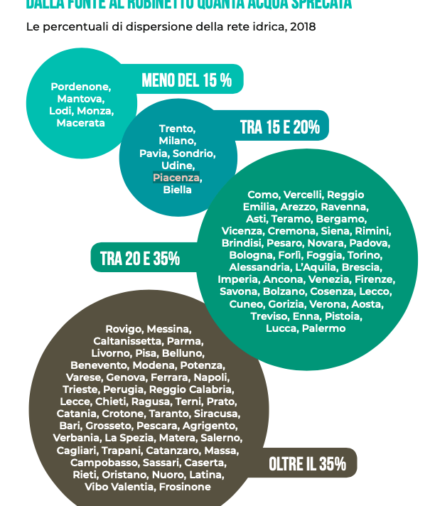 Questa immagine tratta da LEGAMBIENTE, Ecosistema urbano 2019, è abbastanza eloquente, considerando che le perdite idriche in Germania ammontano al 6,5%, in Inghilterra e Galles al 15,5% e in Francia al 20,9%.