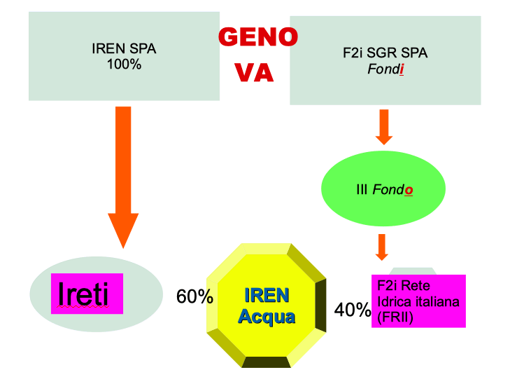 Oggi chi gestisce il servizio idrico a Genova (città )? E’ nuovamente complicato, ci vuole un po’ di attenzione e di pazienza, ma è necessario farsene un’idea perché questi aspetti non sono curiosità senza senso. La ridondante complicazione formale fa parte del quadro, è una sua caratteristica essenziale. A Genova il servizio idrico continua a essere gestito dagli eredi di AMGA. Si tratta di Iren Acqua, società per azioni con due soci: 1) Iren SpA attraverso IRETI, e 2) F2i SGR SpA tramite F2i Rete