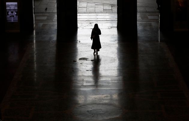 Una pasajera sale de la principal estación de trenes de Milán, Italia, el lunes 9 de marzo de 2020. (AP Foto/Antonio Calanni)