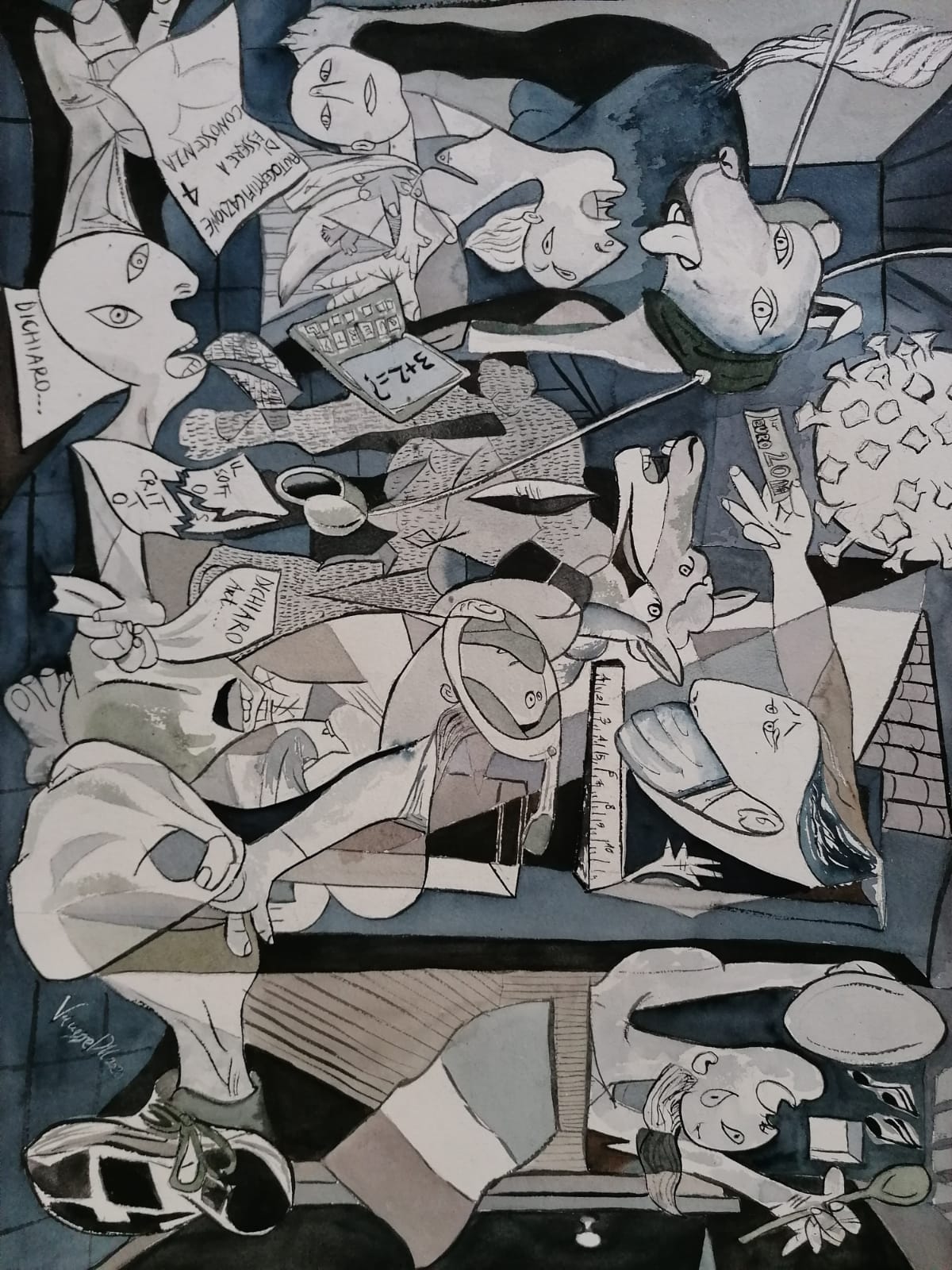 Sembra che l’Ambasciatore tedesco Otto Abetz, in visita allo studio di Picasso, gli abbia rivolto la domanda riferita al Guernica: “è lei che ha fatto questo orrore?”. Picasso rispose: “no, è opera vostra”. Guernica è un racconto immerso nella storia e allo stesso tempo un messaggio senza tempo. È un appello alle coscienze, a non voltarsi dall’altra parte, a essere parte attiva dei dolori del mondo . Rifacendosi ai temi ispiratori della Guernica di Picasso, Vanessa Di Mario, una giovane artista pugliese ha realizzato una Guernica dei tempi nostri e se ci venisse da chiederle “ È lei che ha fatto questo orrore?” La riposta potrebbe essere “No, è opera vostra” Picasso compose il grande quadro in soli due mesi e lo espose nel padiglione spagnolo dell’esposizione universale di Parigi [1] . Guernica fece poi il giro del mondo, diventando un’opera simbolo acclamata; ma soprattutto servì a far conoscere la storia del conflitto fratricida che si stava consumando nel Paese iberico. Il 26 aprile 1937 , degli aerei tedeschi, in appoggio alle truppe del generale Franco contro il governo legittimo repubblicano di Spagna, rasero al suolo, con un bombardamento terroristico , la cittadina basca di Guernica . L’attacco fu una terrificante dimostrazione di bombardamento a tappeto. L’ispirazione per l’opera, improvvisa e all’ultimo minuto come era tipico del genio spagnolo, arrivò quando l’eco della distruzione e della morte giunse al grande artista spagnolo che la realizzò velocemente e con tecniche antiche che ancora oggi, al di là del racconto e della forza del dipinto, suscitano l’interesse degli studiosi. Anche Vanessa Di Mario è rimasta come tutti gli artisti contemporanei coinvolta emotivamente dalla forza del dipinto e in questi giorni di calamità e clausura, di fronte allo strazio del contagio, alla morte che sta compiendo una strage senza precedenti ha voluto replicare il grande capolavoro con una versione adattata ai giorni nostri. I riferimenti sono facili e individuabili, resi più attuali non solo dalla contiguità con la pandemia, ma anche dalla forza e dalla violenza del contagio. Cambiano le guerre, mutano scenari e scopi, ma la sofferenza dell’uomo e la sua fragile presenza sulla terra sono sempre gli stessi e ogni giorno dimostrano i sui limiti inconsistenti.