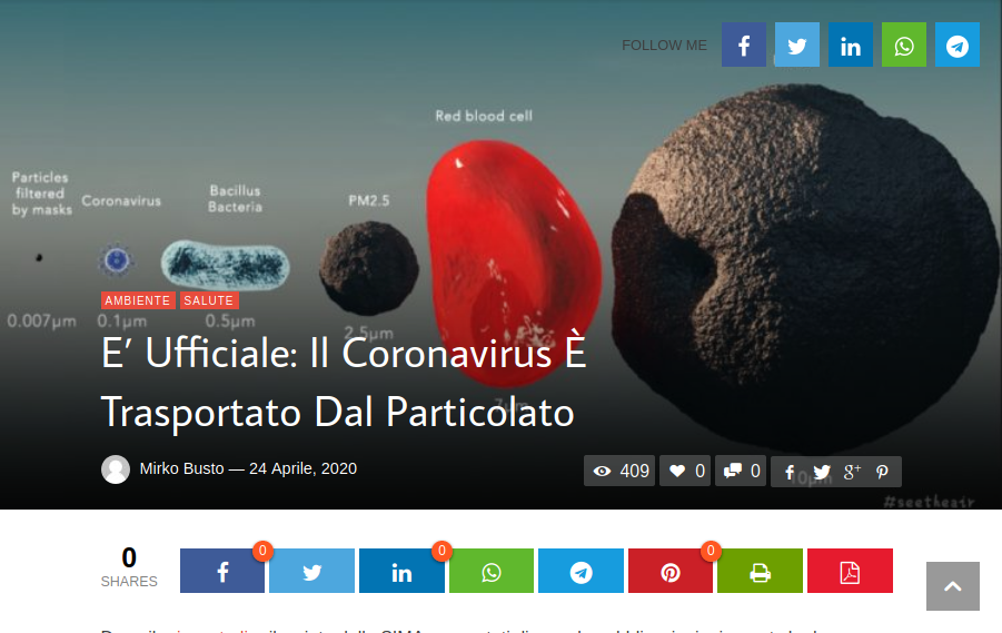 1. Ricevo dall’amico ing. Federico Valerio che ringrazio, questa comunicazione importante relativa al rapporto virus-particolato che vale la pena prendere in considerazione per non diventare estremisti senza capacità scientifica di analisi,
