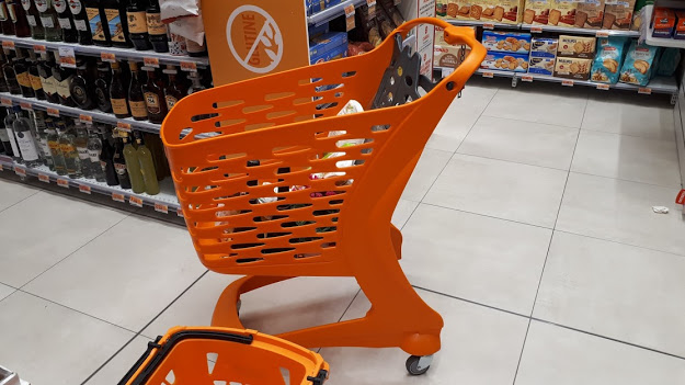 Nota aggiunta dopo la pubblicazione:Non è che io voglio fare l’orco mangia-plastica. Ho telefonato alla Conad per sentire che politica di riciclo hanno con questi carrelli. La persona che mi ha risposto non ne aveva la minima idea. Le ho chiesto se c’è un ufficio relazioni con il pubblico, ma mi ha detto che non esiste. Le ho chiesto se potevo domandare a qualcuno, e mi ha detto “guardi sul nostro sito” — le ho detto che avevo guardato, ma non avevo trovato niente. Al che mi ha detto, “provi a domandare al negozio dove ha visto quei carrelli” — saluti e arrivederci. Beh, così vanno le cose.