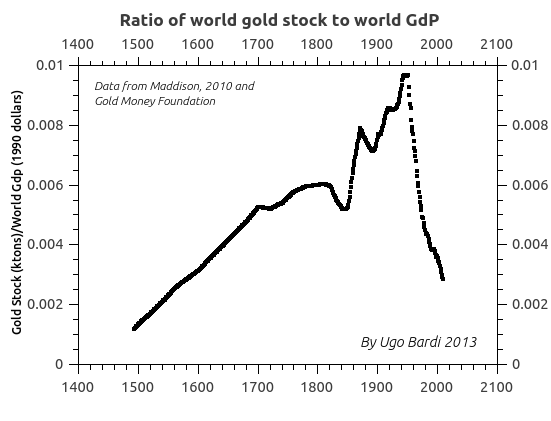 Sappiamo che la storia non si ripete mai, ma fa rima. Allora, a che punto siamo adesso? Il denaro che tiene unito l’Impero Globale, oggi, non è basato sui metalli preziosi e non rischiamo di crollare perché le nostre miniere cessano di produrre oro. In effetti, ci sono prove evidenti che la produzione di oro e la crescita economica si sono dissociate in tutto il mondo negli anni ’50 . Quindi usare l’oro come base per un sistema monetario è passato di moda negli anni ’70.