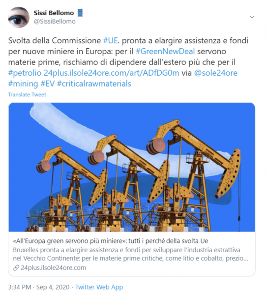 Non si tratta di una distopia, di un futuro lontano avvolto nelle nebbie del probabilmente e del forse: la Commissione Europea ha appena annunciato un programma di finanziamenti per l’industria mineraria europea e il prezzo del rame vola (+40% da marzo a oggi), trainato proprio dalla domanda legata alle auto elettriche cinesi e al Green Deal europeo. Ci siamo già dentro, stiamo già devastando centinaia di ecosistemi alla ricerca di litio e cobalto per le batterie o terre rare per i magneti delle turbine eoliche.
