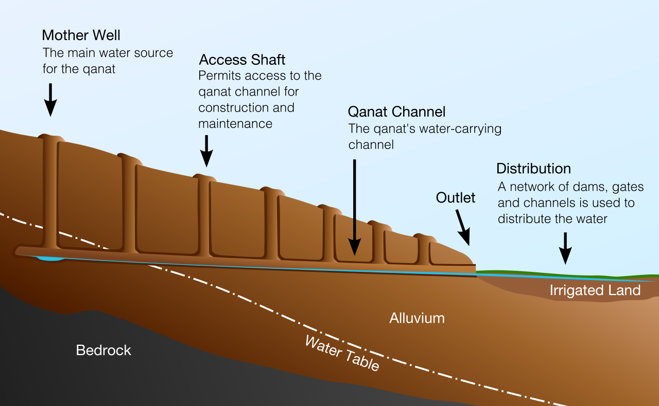 Ma sono riusciti a prosperare per mezzo di un sofisticato sistema di irrigazione. Si chiama tecnologia foggara in Nord Africa, in persiano è kārēz e in arabo Qanat . (immagine da Wikipedia )