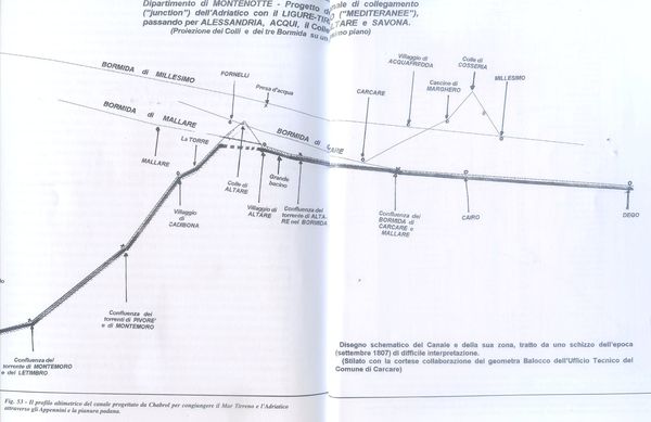 La valle stessa, in molti punti, sembrerà scavata dalla mano dell’uomo per costruirvi il canale Infine le acque che all’uscita di questa valle scorreranno sulla cima delle montagne dominando bacini di straordinaria profondità, la galleria che attraverserà la cresta degli Appennini, i due vicini serbatoi (di Ferrania e dell’Isola Grande) disposti con arte”. Quest’idea non poteva essere patrocinata e realizzata che da Chabrol, sia per la sua esperienza specifica, sia perché egli era il prefetto del Dipartimento che comprendeva il valico più basso della dorsale ligure-piemontese. Infatti, il “Colle di Altare” (come lui fa notare” si elevava appena all’altezza di 490 metri contro i 700-1.000 metri degli altri valichi; inoltre dopo il valico di Altare si apriva una valle (quella dei Bormida fiumi di Mallare e di Spigno) che arrivava, con un leggero e costante declivio, sino ad Alessandria.