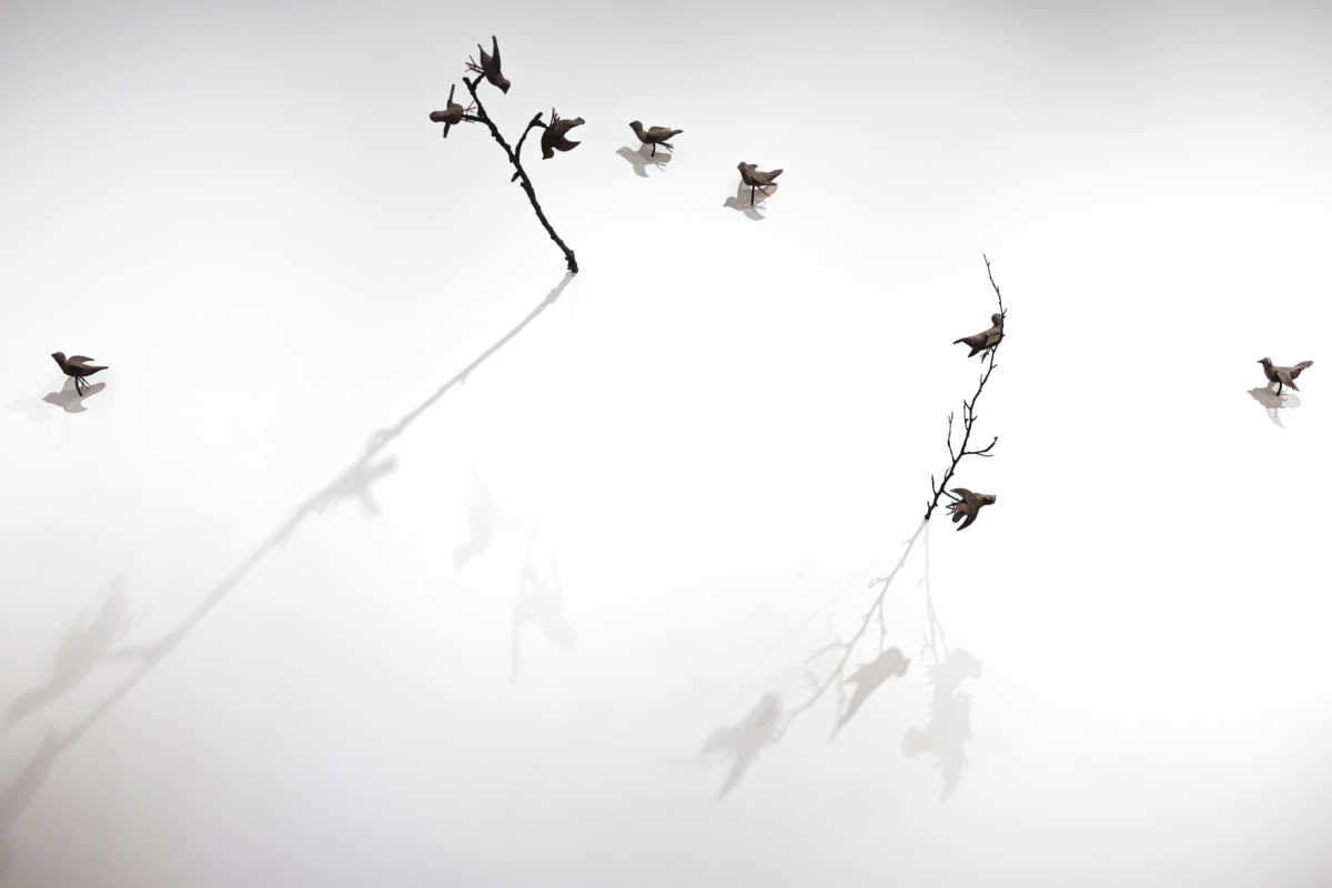Nel lavoro artistico di Sabrina Mezzaqui prende forma il ramo, nasce dal muro avanza nello spazio, fornisce sostegno a minuscoli uccellini che ci si poggiano leggeri. Le parole di Elisa Biagini galleggiano ricamate su un telaio invisibile, si legano alla materia e tra loro snodandosi e riannodandosi come la trama di un tessuto.