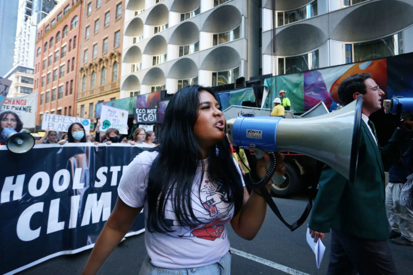 Attivisti per il clima manifestano a Sydney in Australia nel quartiere degli affari durante lo “School Strike 4 Climate” del 6 maggio 2022. (Foto di Truthout)