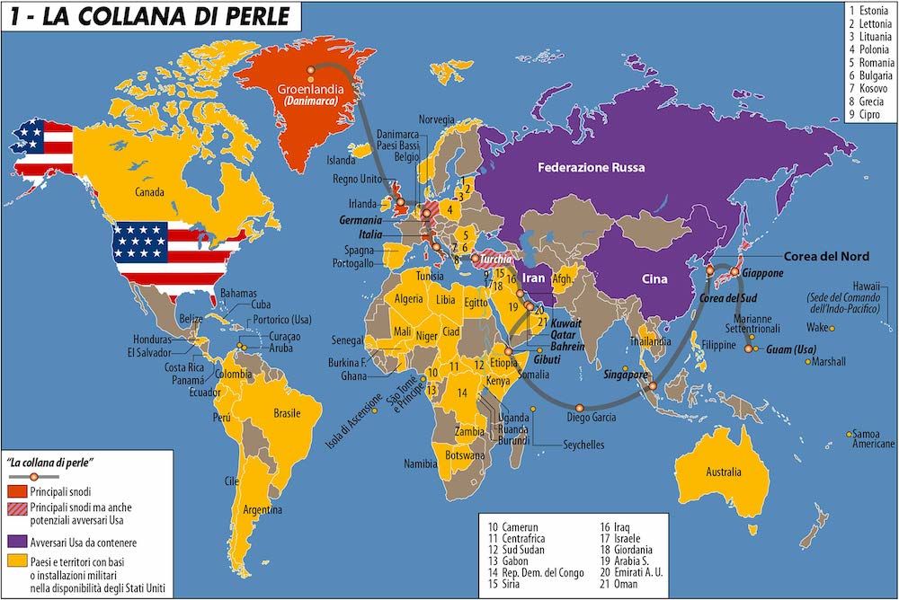 La collana di perle non esaurisce nel complesso la presenza militare americana nel mondo, ma raccoglie snodi strategici percepiti dagli Stati Uniti come insostituibili proprio perché strumento di contenimento degli avversari considerati in grado di sfidarla. Mostra quanto l’America sia estroflessa, pur volendo nascondere a sé stessa la propria natura imperiale.