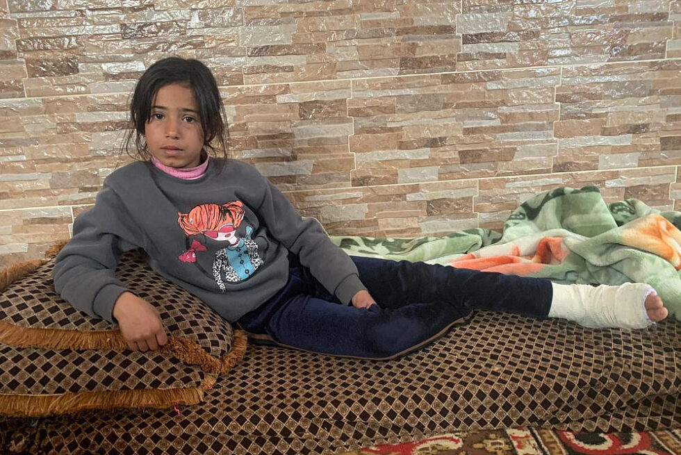 Qamar Elian, una bambina palestinese del villaggio cisgiordano di Umm Lasafa, nella sua casa dopo che un soldato israeliano le aveva rotto a calci la caviglia mentre si avviava con la famiglia verso il loro terreno privato. (Foto: Basil Adra)