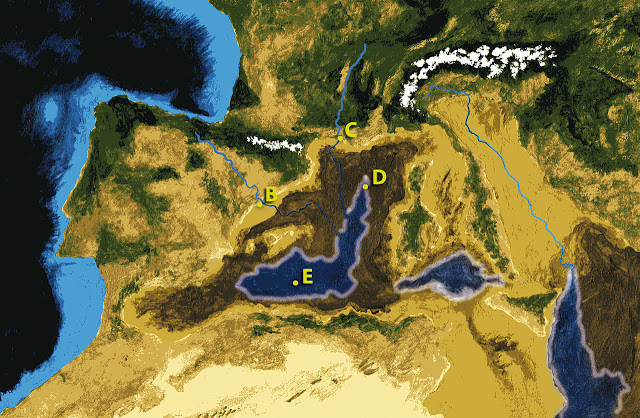 Ecco come avrebbe potuto apparire il Mediterraneo durante la crisi di salinità: un bacino chiuso, contornato da catene collisionali, in ambiente arido, soggetto a forte evaporazione, ove avveniva la deposizione di sali per evaporazione di acqua marina.