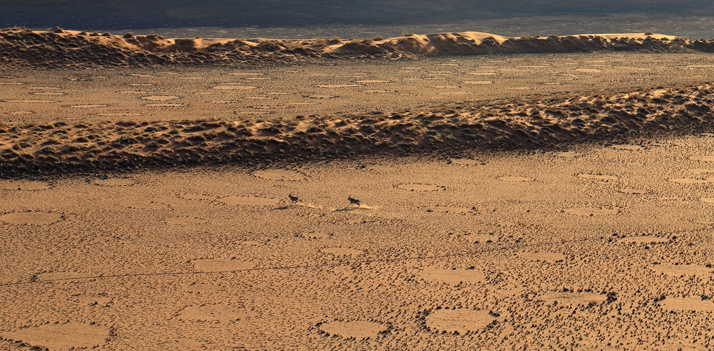 Auro Michele Perego / IMMAGINE: ORICI CORRONO TRA I CERCHI DELLE FATE IN NAMIBIA, FOTO DI NICOLAS RÉNAC, COPYRIGHT.