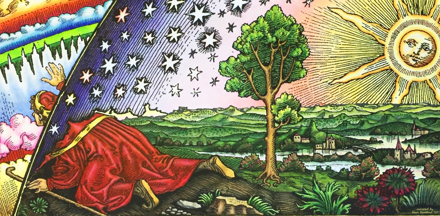 IMMAGINE: “L’ATMOSHPERE: MÉTÉOROLOGIE POPULAIRE” DI CAMILLE FLAMMARION, 1888. COPIA A COLORI DELL’INCISIONE, DETTAGLIO.