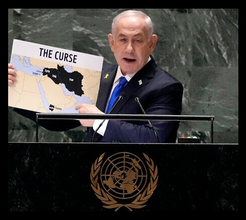 Netanyahu, all’ONU, ha mostrato una cartina nella quale l’area di influenza politica e militare iraniana (Iran, Iraq, Siria, Yemen, Hamas), tutta nera, era definita “the curse” ovvero “la maledizione” ovvero la causa di tutti i problemi ed instabilità del Medio Oriente altrimenti votato a pacifiche relazioni si cambio commerciale tra arabo sunniti ed il suo paese mediterraneo, il famoso progetto “Accordi di Abramo-Via del Cotone”. Cercando così di rinfocolare lo storico dissidio sciiti-sunniti faticosamente ricucito dai cinesi negli ultimi tempi.