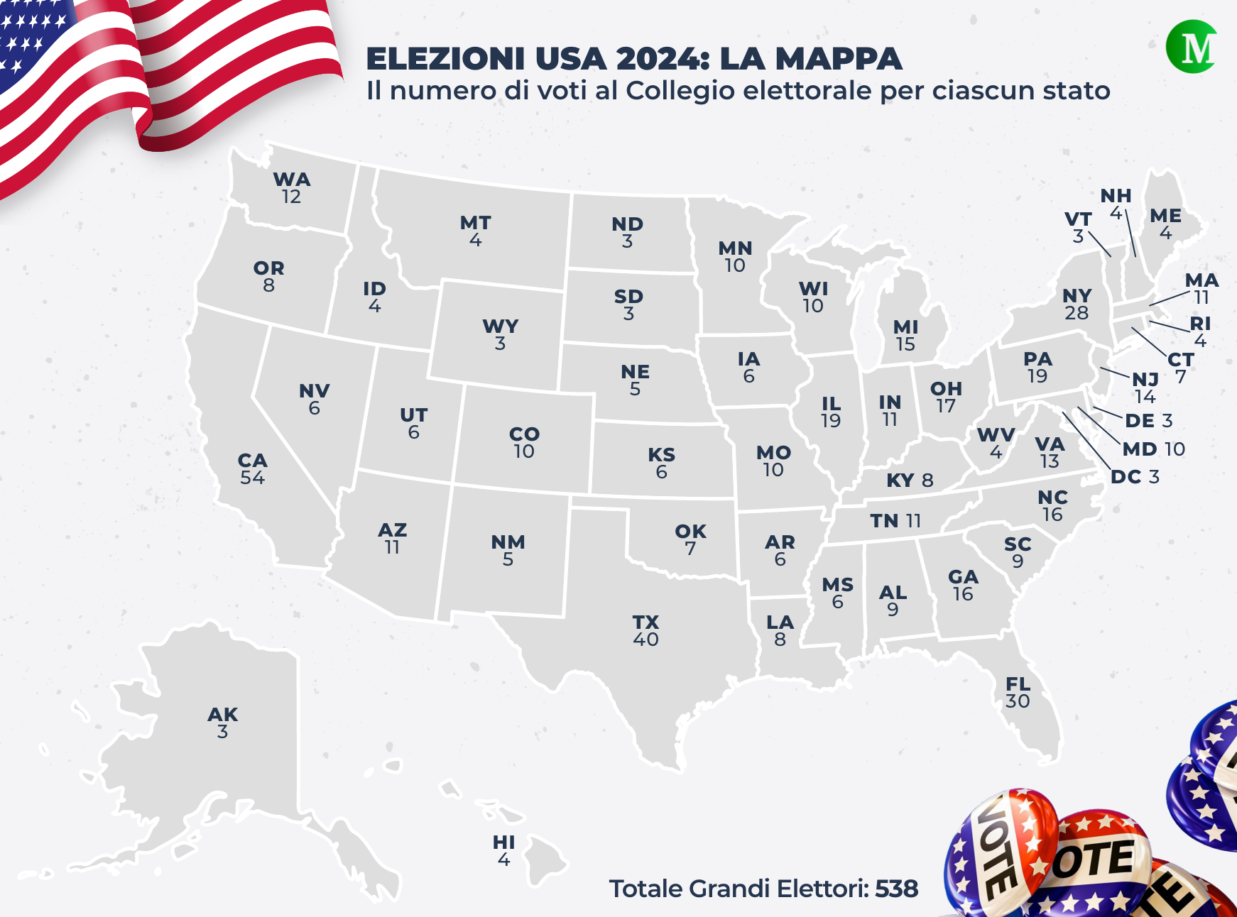Le elezioni negli Stati Uniti non riguardano solo la Casa Bianca, ma anche il Congresso e altre cariche locali. Per ottenere la Presidenza, Donald Trump ha dovuto superare 270 voti elettorali su 538. La California è lo stato con il maggior numero di elettori (54), mentre stati chiave come la Pennsylvania ne hanno assegnati 19. Anche questa volta la corsa ai grandi elettori è stata cruciale e influenzata dagli esiti in stati chiave come Georgia, Carolina del Nord, Pennsylvania, Michigan, Wisconsin, Nevada e Arizona, i cosiddetti “swing states” che spostano l’equilibrio elettorale. Quest’anno sono stati 244 milioni gli americani aventi diritto al voto.