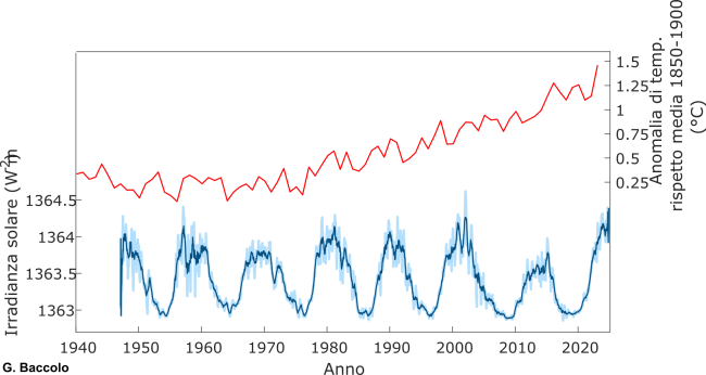 Osservando i dati risulta però evidente una cosa: i cicli solari salgono e scendono ogni 11 anni. Se fosse la variabilità solare a produrre il cambiamento climatico, dovremmo osservare l’alternanza di deboli riscaldamenti e deboli raffreddamenti, in accordo alla ciclicità solare. Non dovrebbe invece essere presente un trend di lungo periodo che riguarda la temperatura (curva rossa).