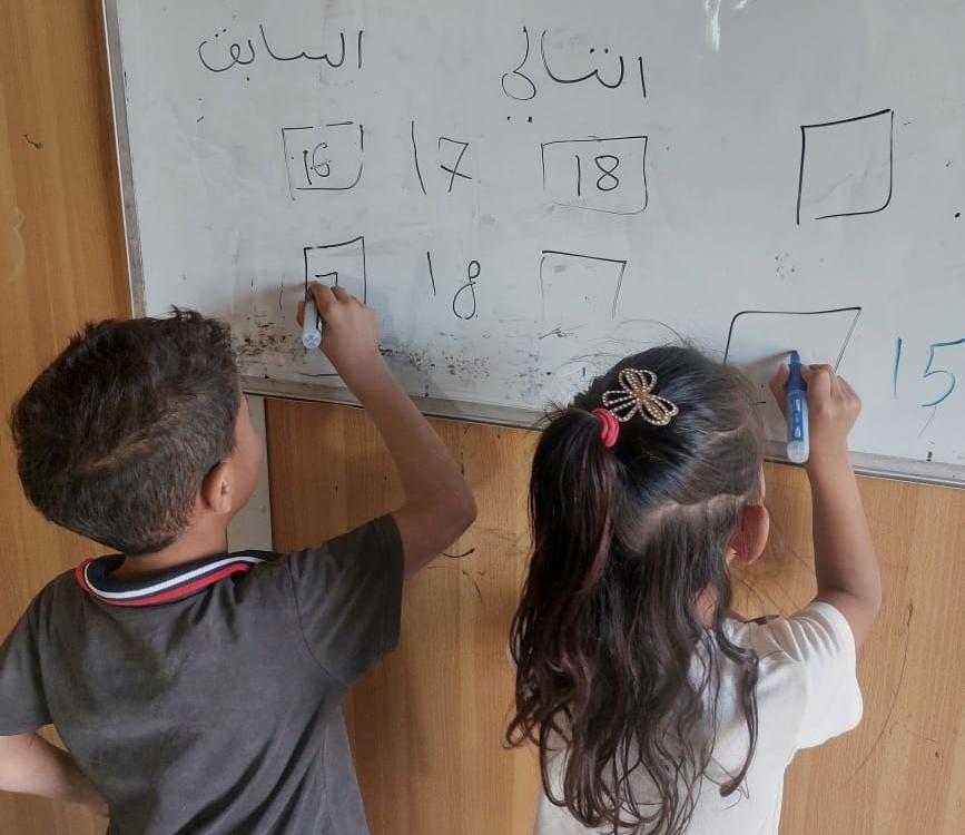 Esercizi di matematica collettivo durante il recupero scolastico promosso da Vento di terra con i bambini siriani di un campo profughi in Giordania