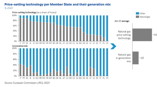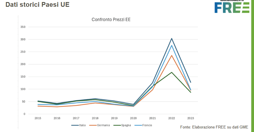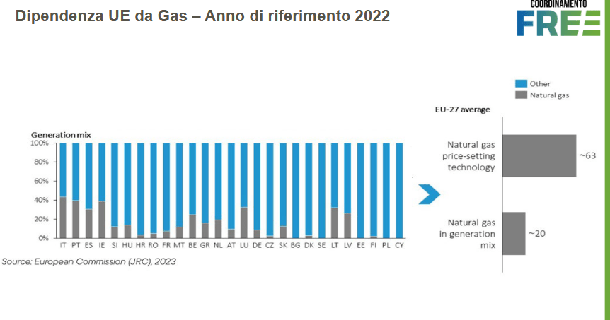 Oggi, a livello europeo, il gas ha una minore influenza sui prezzi medi espressi dal mercato in quei paesi dove la dipendenza dal gas è inferiore rispetto a quella italiana. In aggiunta, non sono rare le situazioni in cui, per effetto di abbondanza di produzione da eolico e/o da fotovoltaico, in molti Paesi europei si assiste a situazioni di prezzi orari molto bassi e persino tendenti a zero, a dimostrazione