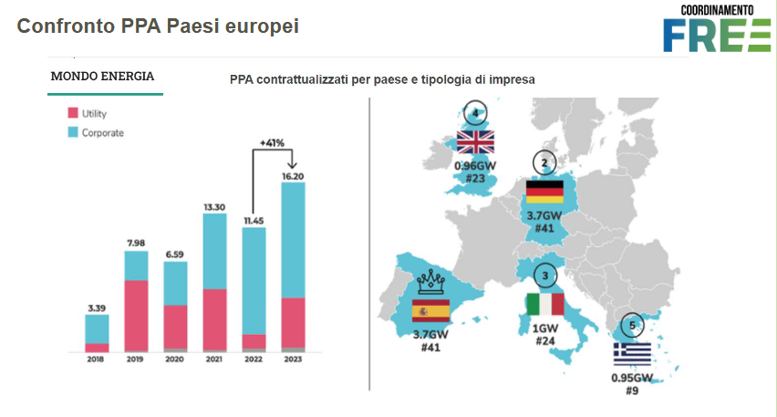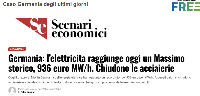 Anche in Germania, dove, nel primo semestre del 2024, la quota di energia rinnovabile ha coperto il 61,5% della produzione elettrica, si assiste negli ultimi anni mediamente a prezzi dell’EE di almeno il 30% più bassi di quelli italiani.