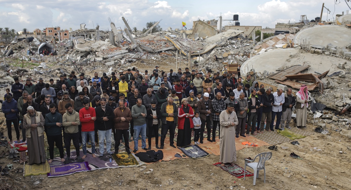 La preghiera del venerdì vicino a una moschea distrutta a Khan Yunis, il 24 gennaio 2025 (AP Photo/Jehad Alshrafi)