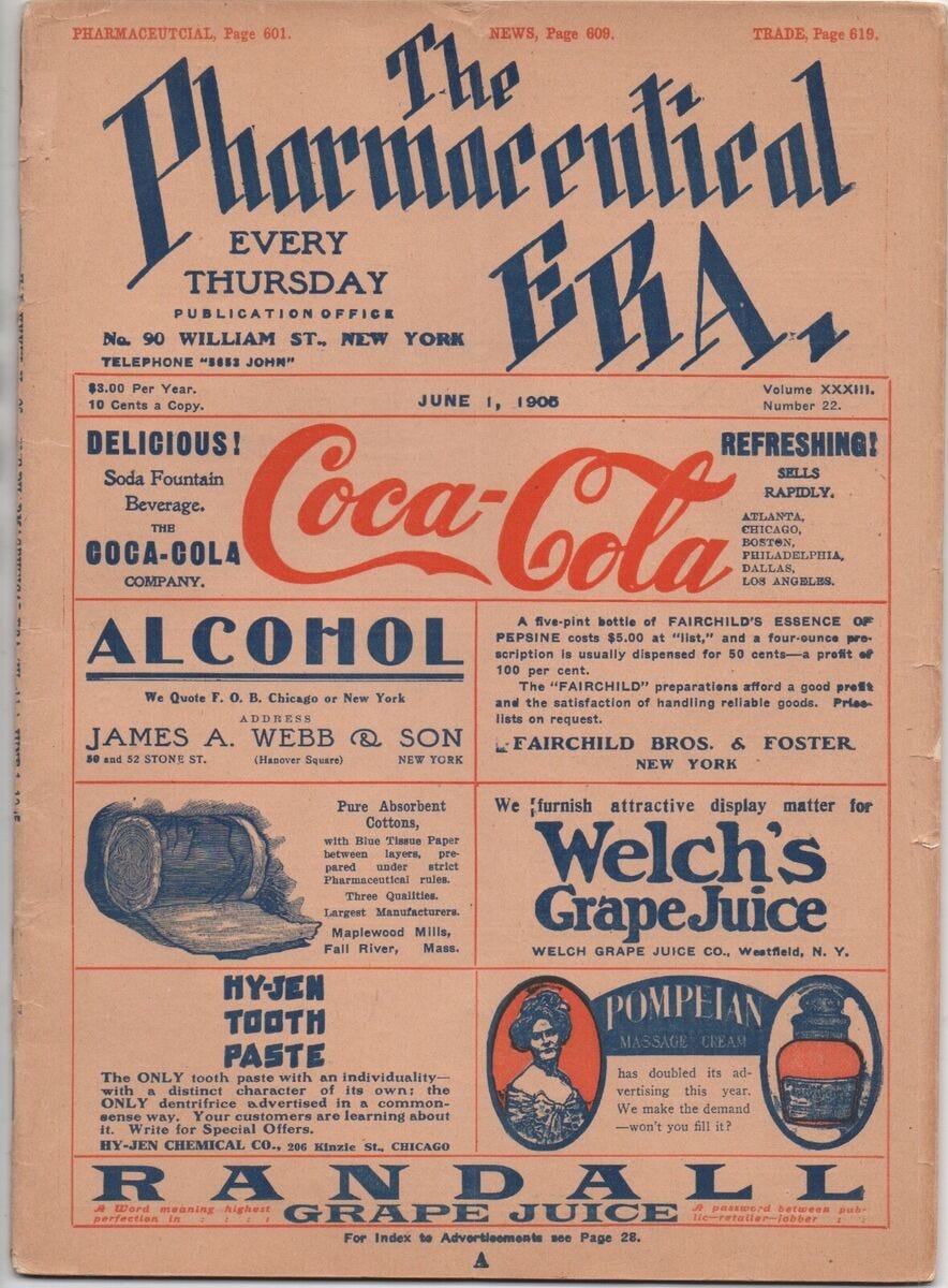 Abbiamo gia’ parlato del mondo impazzito per la “coca” + “qualsiasi altra cosa” a cavallo fra il 1860 e il 1915. Mentine, dentifrici, calmanti, prodotti di bellezza e sopratutto bevande.