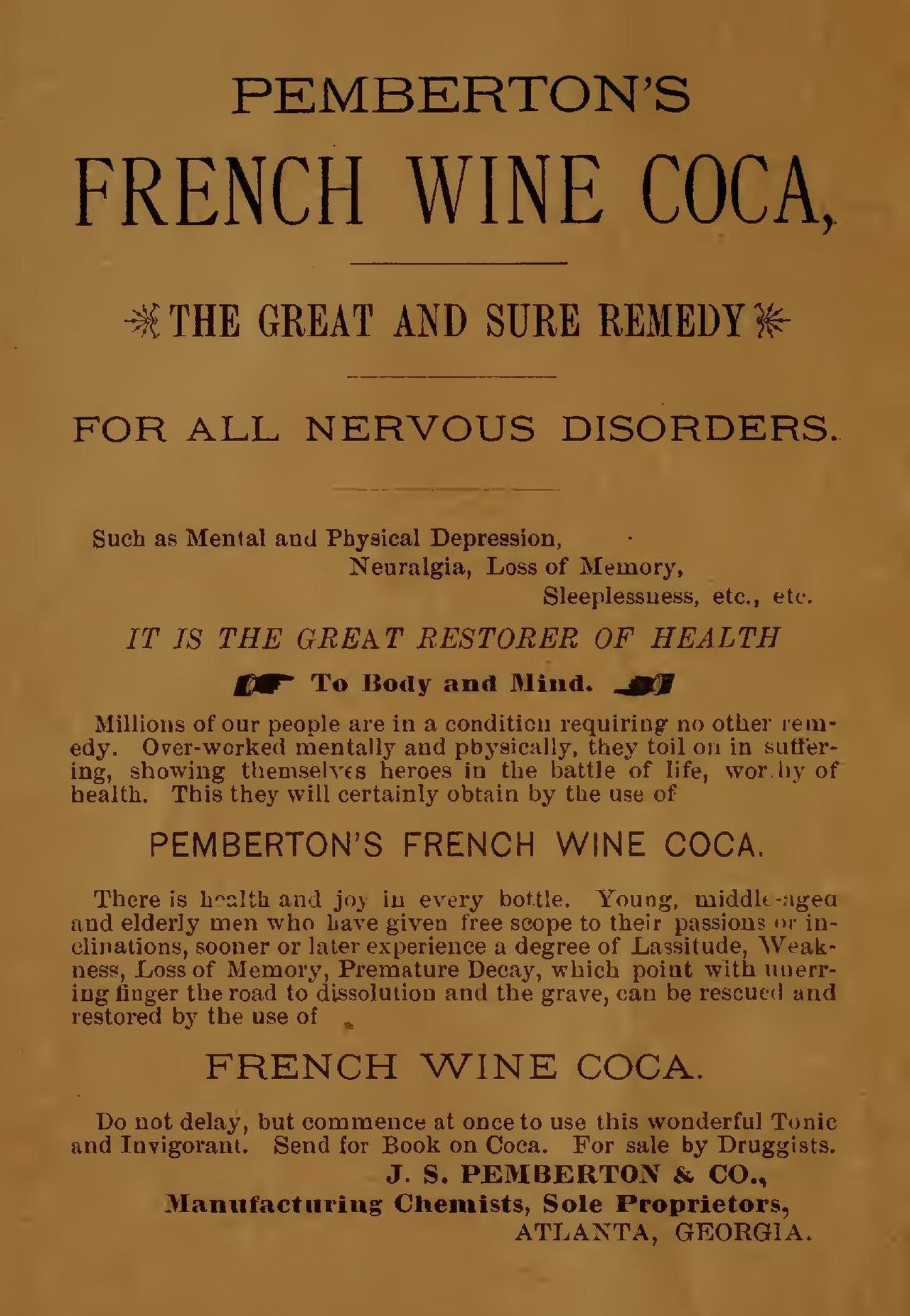 Come per il vin Mariani, il French Wine Coca era un “meraviglioso invigorante degli organi sessuali”, un metodo per combattere la “neurastenia” fra le donne del Sud (tipo Rossella O’Hara) e per tutti quelli che avevano problemi di nervosismo, gastrici, constipazione, impotenza. In generale avrebbe aiutato scienziati, poeti, uomini di cultura, avvocati, medici e tutti quelli “stanchi di mente”. Veniva anche pubblicizzato come cura per la dipendenza dalla morfina, che Pemberton ben conosceva.