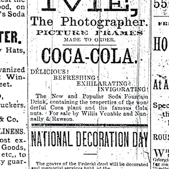 La prima pubblicita’ arrivo’ dopo qualche settimana, il 29 Maggio 1886 sull’Atlanta Journal. Una riproduzione e’ qui sotto, con le magiche proprieta’ di questa bevanda con foglie di coca, noci di cola e bollicine. Imbattibile davvero!