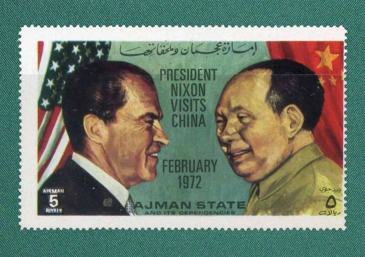 Francobollo commemorativo della visita del presidente americano Richard Nixon in Cina nel 1972, emesso dall’Emirato di Ajman (Emirati arabi uniti). Foto Public Domain.