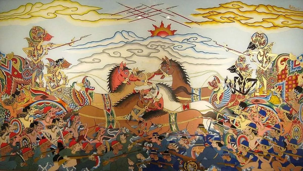 «La Battaglia di Bharatayudha», l’evento bellico centrale del Mahābhārata, il poema epico dell’antica India. Pittura su vetro in stile wayang: a sinistra Karna e Salya, a destra Arjuna e Kresna. Foto di Gunawan Kartapranata. Licenza CC BY-SA 3.0.